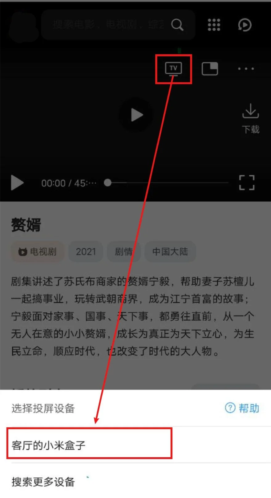 打开QQ浏览器(会接管网页播放器)->打开免费短视频分享大全 - 大中国->播放视频->选中投屏图标->等待搜寻出智能电视/电视盒子->选中,即可投屏。